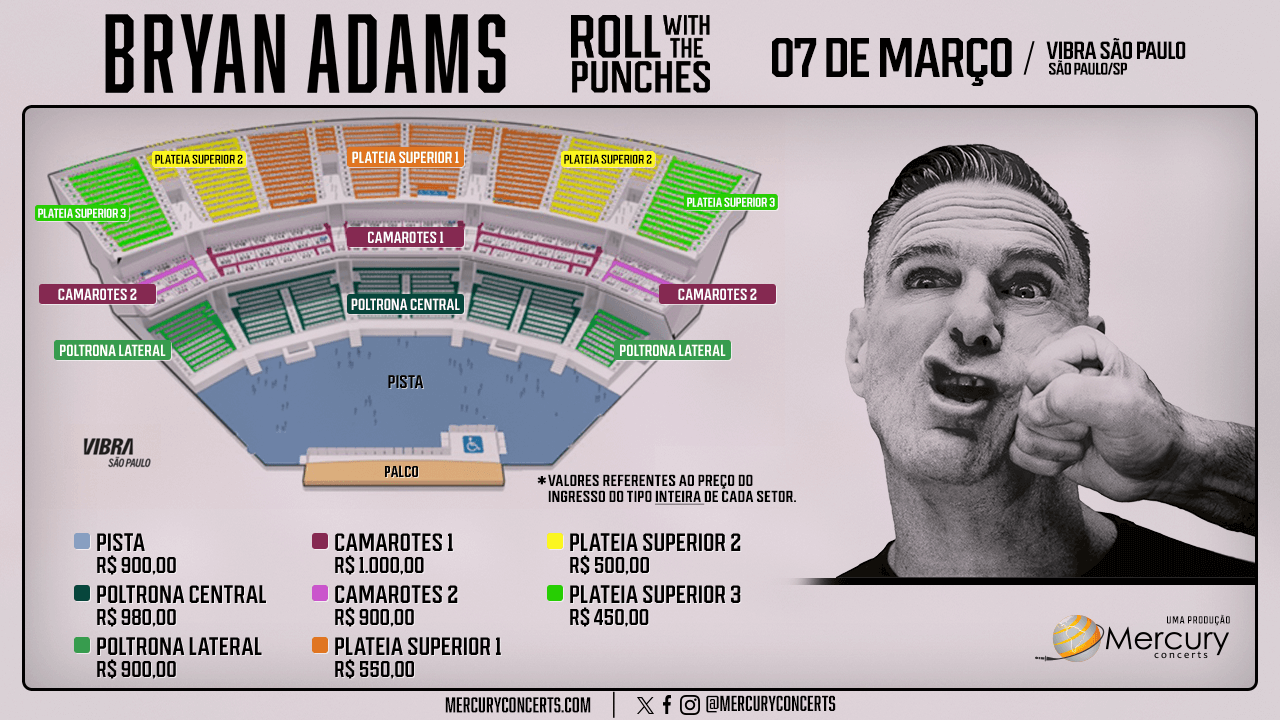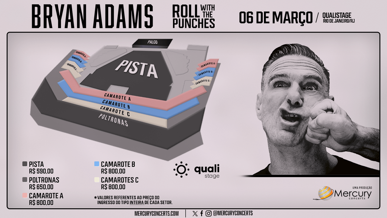Com quase quatro décadas de carreira e sucessos que marcaram gerações, Bryan Adams retorna ao Brasil em março de 2026 para quatro apresentações da turnê Roll With The Punches. Com produção da Mercury Concerts, os shows serão nos dias 06 de março (sexta-feira) no Qualistage Rio de Janeiro, 07 de março (sábado) na Vibra São Paulo, 09 de março (segunda-feira) no Live Curitiba em Curitiba e no dia 11 de março (quarta-feira) no Auditório Araújo Vianna em Porto Alegre. As vendas de ingressos começarão no dia 04 de novembro, às 10h, por meio do site www.eventim.com.br/bryanadams.