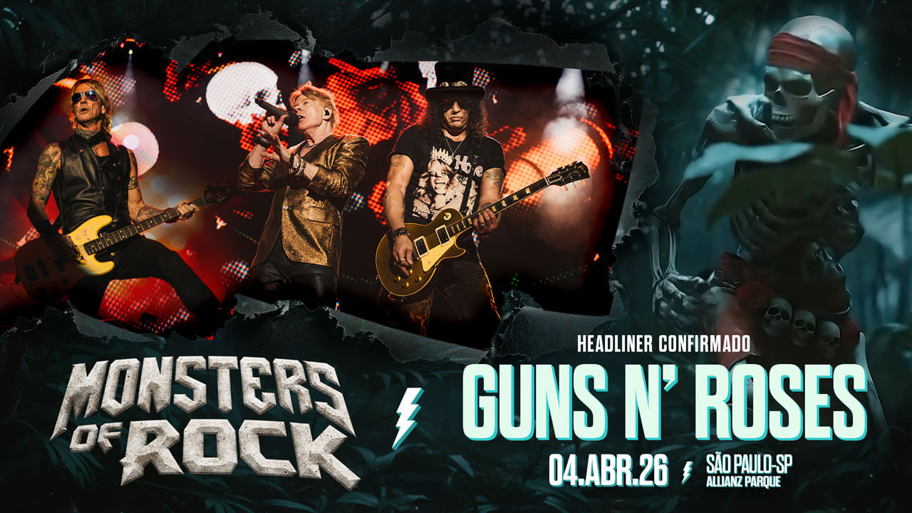O Guns N’ Roses anuncia uma nova etapa da turnê "Because What You Want and What You Get Are Two Completely Different Things" no Brasil. Além de se apresentar no Monsters of Rock, no dia 4 de abril, no Allianz Parque, a banda confirmou mais oito shows em abril de 2026: 01/04 em Porto Alegre; 07/04 em São José do Rio Preto/SP; 10/04 no Rio de Janeiro/RJ; 12/04 em Cariacica/ES; 15/04 em Salvador/BA; 18/04 em Fortaleza/CE; 21/04 em São Luís/MA; e 25/04 em Belém/PA.